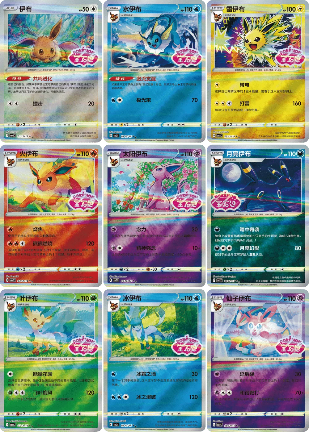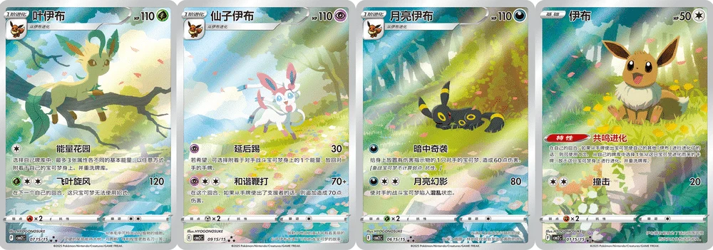 These full-art pieces are designed to form a cohesive visual narrative when placed together — a lush forest scene featuring the Eeveelutions and Eevee itself. These illustrations were created by the artist HYOGONOSUKE, known for his evocative style in previous Pokémon sets.
